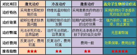 成都军大医院疥疮医师组推出"高分子生物组合疗法",在祖国医学理论基础上融入现代医学之精华,精选多种地道中药材,采用目前国际的高分子凝聚萃取技术生产而成组合用药,通过洗、敷、熏,再加内用,针对疥疮进行全方位多层次治疗。高分子生物组合疗法选用纯中药制剂,不含任何激素和抗生素成分、不过敏、无依赖性、无任何毒副作用,1到2个疗程即可康复疥疮、疥疮结节,临床应用后深受业内和患者好评。
