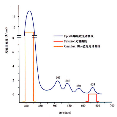 光动力疗仪可以输出纯度接近99%的窄谱蓝光,非常接近青春痘内源性卟啉的吸收光谱。高纯度蓝光几乎全部能量有效作用于靶目标-青春痘丙酸杆菌(P.)上。应用光动力治疗原理,青春痘丙酸杆菌(P.)内源生成的光敏剂卟啉被415nm 的蓝光激活(卟啉的主要成分为粪卟啉Ⅲ)产生光毒环境,转换成的毒性单态氧迅速杀死青春痘丙酸杆菌,进而将皮肤上的青春痘清除。